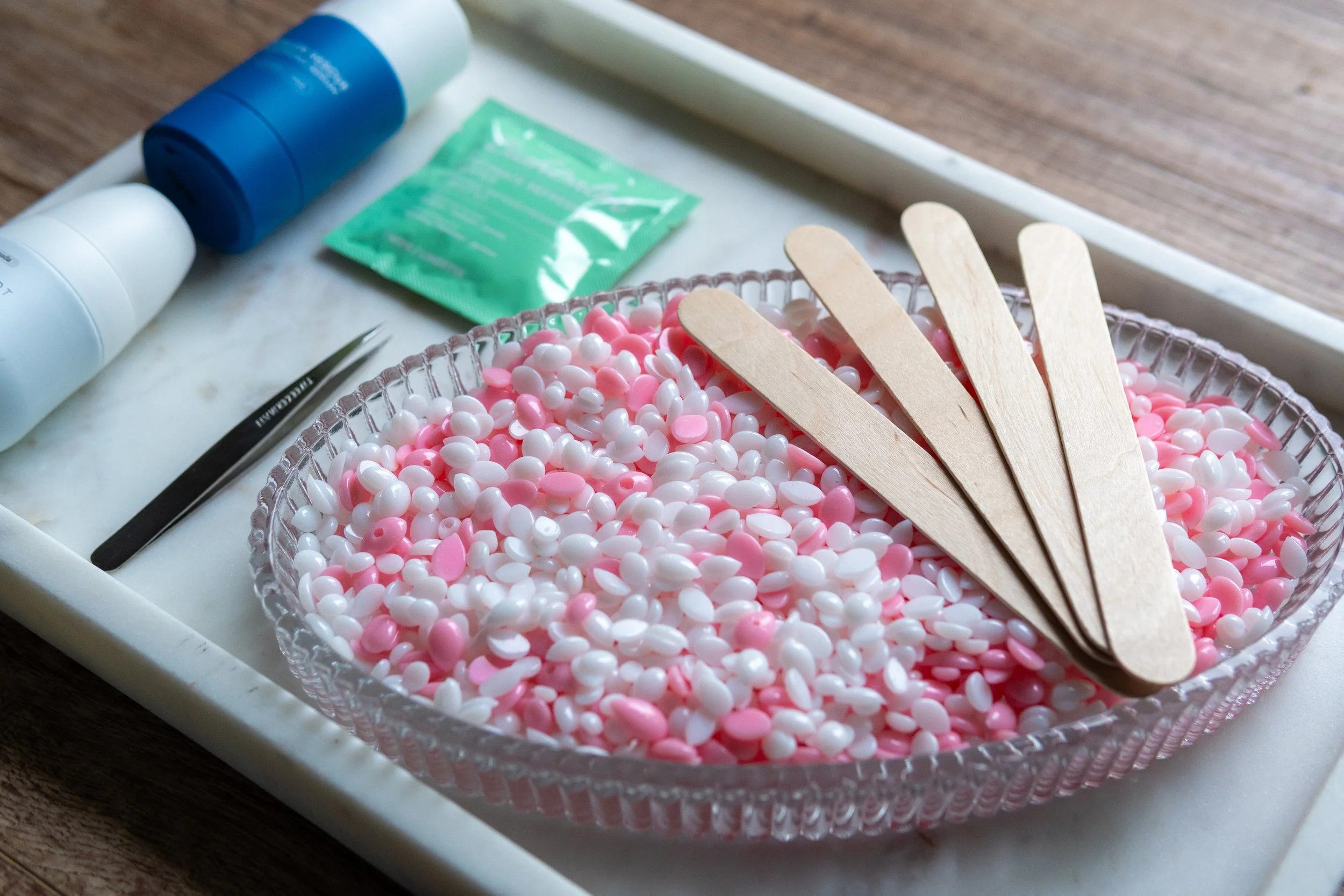 Hard wax is used for intimate areas, and soft wax is used for larger areas like arms, legs, and torso.